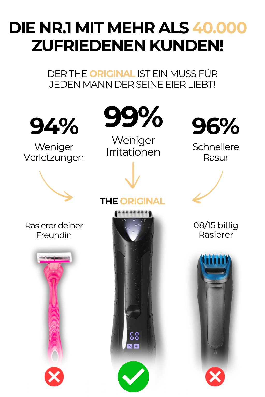 Pro Tipp für die Eier: Wer seine Hoden rasieren möchte sollte vorher die Haut am Hodensack sehr straff ziehen, sodass keine Falten mehr zu sehen sind. Danach langsam und sicher mit dem mitgelieferten Trimmeraufsatz in Schnittrichtung schneiden.